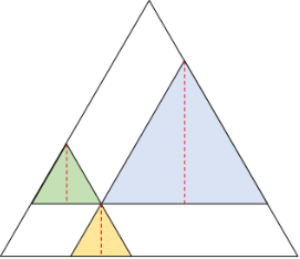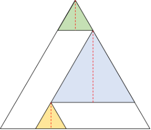La altura de cada triángulo de color es la misma, desde cualquier vértice que la midamos (porque son triángulos equiláteros). La figura que sigue nos muestra las alturas de cada triángulo de color, ahora medidas verticalmente. La suma sigue siendo la misma.