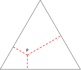 Si quisiéramos acampar en un punto de la isla de manera que la suma de las distancias a los tres lados sea mínima, ¿Cuál sería la mejor posición para instalar la tienda de campaña? La distancia hacia los tres lados se mide perpendicularmente a ellos, desde el campamento. La figura muestra una isla como la propuesta, con tres lados iguales y un posible punto P para acampar. Las líneas rojas muestran las distancias hacia cada lado.