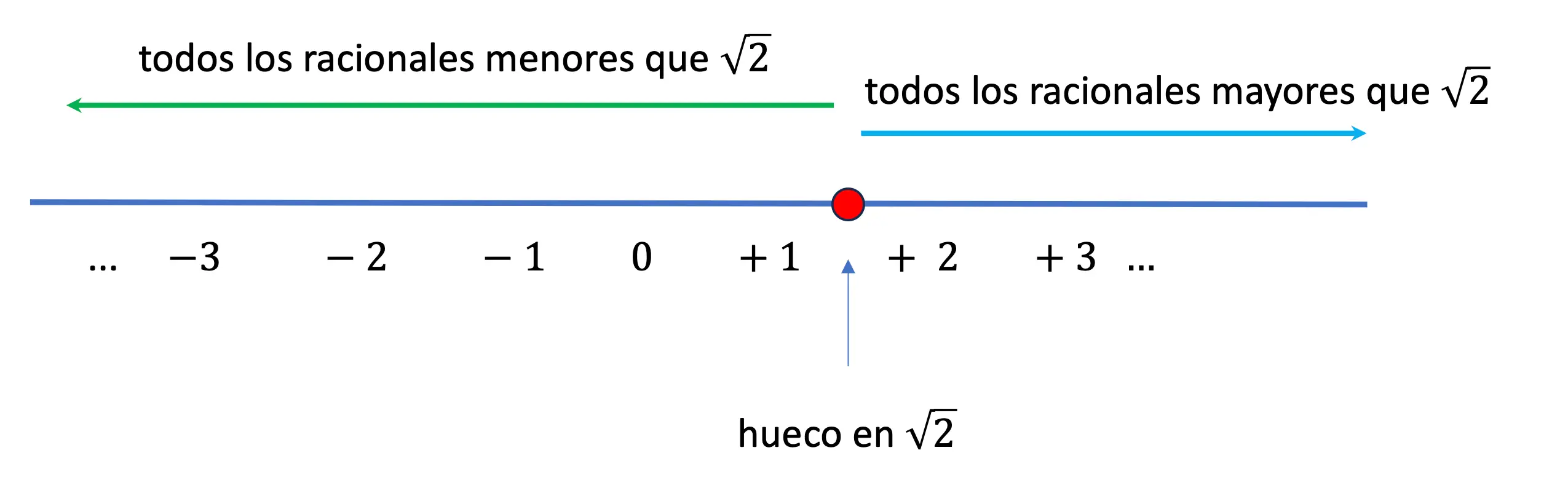 La figura adjunta muestra la idea: en la línea del continuo de los números, los griegos tenían un agujero en la posición 2‾√ 2 . Pero ese número puede ser entendido como la relación 2‾√ 2 /1. Todos los racionales 𝑚/𝑛 m / n por arriba de 2‾√ 2 , junto con todos los racionales por debajo, marcan la posición exacta del hueco. Si lo mismo sucede simultáneamente para 𝑐:𝑑 c : d , es que 𝑐:𝑑 c : d representa la misma razón que 2‾√ 2 /1.