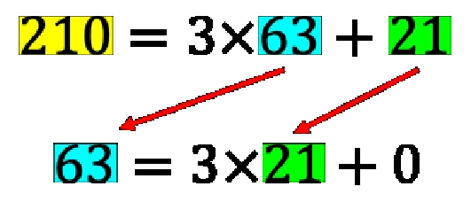 Lo que muestra este ejemplo es que 21 divide exactamente a 63 (63 dividido por 21 es 3) y además como 210 contiene tres veces al 63 y una vez al 21, el 21 divide exactamente a 210 y a 63. Es un factor común y además, como se puede demostrar, es el máximo factor común posible.