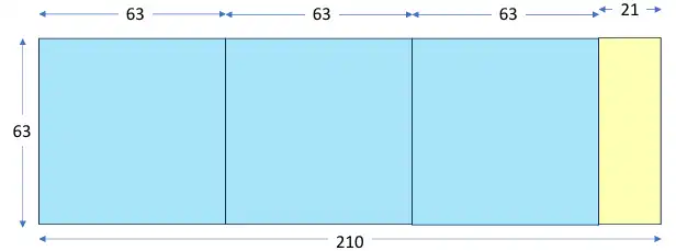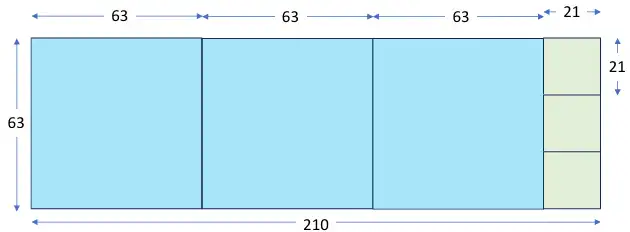 Hay una manera de visualizar al algoritmo de Euclides de divisiones sucesivas utilizando una figura geométrica. Supongamos que queremos encontrar el MCD de los números 210 y 63. Dibujamos entonces un rectángulo con un lado de 210 unidades y el lado adjunto de 63, como muestra el diagrama.