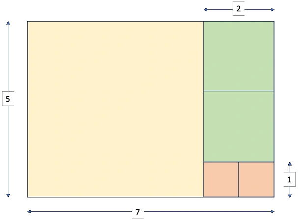 El ejemplo final que queremos mostrar es el de los dos números 5 y 7, que no tienen otro factor común mayor a1. El diagrama muestra el desarrollo del algoritmo de Euclides, que termina con cuadrados de lado igual a 1. Hemos omitido especificaciones redundantes de las longitudes de los ladosde los cuadrados.