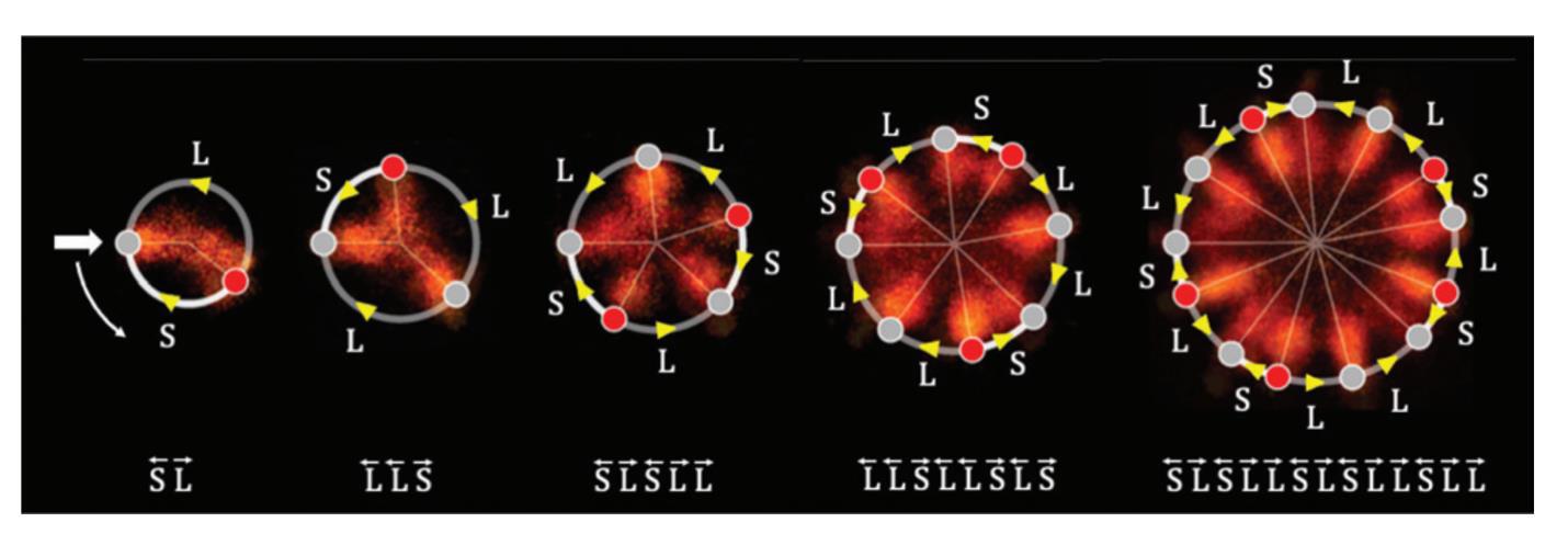La Fig. 3 muestra el proceso, de izquierda a derecha. Comenzamos con un primordio en gris y se genera uno nuevo, en rojo, que además se acerca por un lado al primordio más antiguo dejando un lado largo en el anillo (L) y un lado corto (S). Un nuevo primordio se genera en el lado L que tiene más espacio, se acerca al primordio más antiguo, y subdivide al segmento L original en un segmento S y uno L. La regla, como se ve, es qué, si escribimos las letras del anillo como una palabra, pasamos de una configuración SL a LLS, luego SLSLL y así sucesivamente. El segmento S se convierte en L en cada siguiente generación, y el segmento L en SL. Es como un juego de substitución de letras por otras. Lo importante, sin embargo, es que en cada generación obtenemos un número de primordios igual a un número de Fibonacci, es decir: 2, 3, 5, 8, 13, etc.