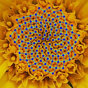 El ángulo de rotación del anillo de primordios es también muy especial. Aparentemente produce la forma más compacta de organizar a las semillas en la flor. El rompecabezas en la Fig. 4, nos da una idea tanto de la forma en la que surge una espiral y una contraespiral al ir girando los primordios bajo la restricción de generar un empaque lo más denso posible.