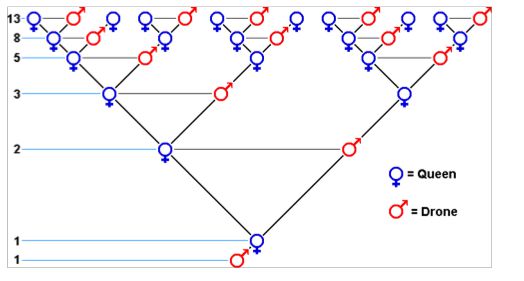 Si seguimos el árbol genealógico de un zángano hacia atrás, aparece una sorpresa. Ese zángano tiene un solo progenitor: su madre. La madre, en cambio, tiene dos progenitores. Por lo tanto, el zángano tiene dos abuelos. Pero al retroceder una generación más, la situación se vuelve asimétrica: la abuela tiene dos padres, mientras que el abuelo (que es macho) tiene solo uno. El resultado es que el número de bisabuelos es tres.