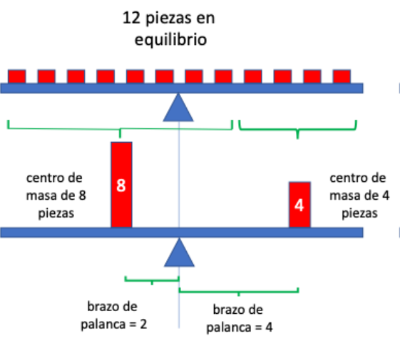 Comenzamos con 12 piezas rectangulares en equilibrio sobre el fulcro de una balanza. Ahora bien, podemos agrupar ocho piezas, comenzando desde la izquierda, y las sustituimos por un peso equivalente situado en su centro de masa (la barra roja marcada con 8). Lo mismo hacemos con las cuatro piezas restantes (barra roja marcada con 4). El lector puede verificar que los brazos de palanca son, respectivamente, 2 y 4. La balanza sigue en equilibrio porque 8x2 =4x4 Esta es la ley general de la palanca.