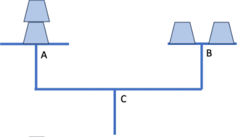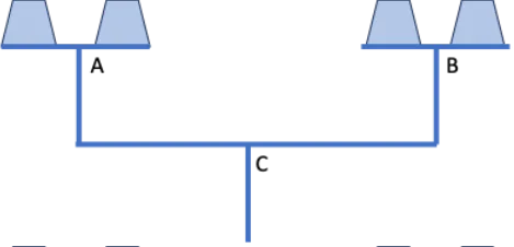Además de estos sencillos axiomas, Arquímedes opera con el concepto de “centro de masa”. Este es el punto sobre el que se puede apoyar un objeto sin que este se incline hacia un lado o hacia el otro. La figura adjunta muestra una balanza doble. Los platos de la balanza son a la vez sendas balanzas (con fulcros A y B, respectivamente). Por simetría de la construcción, ninguna de las dos balanzas superiores, y tampoco la inferior, se puede inclinar ni hacia la izquierda ni hacia la derecha de los fulcros A, B y C.