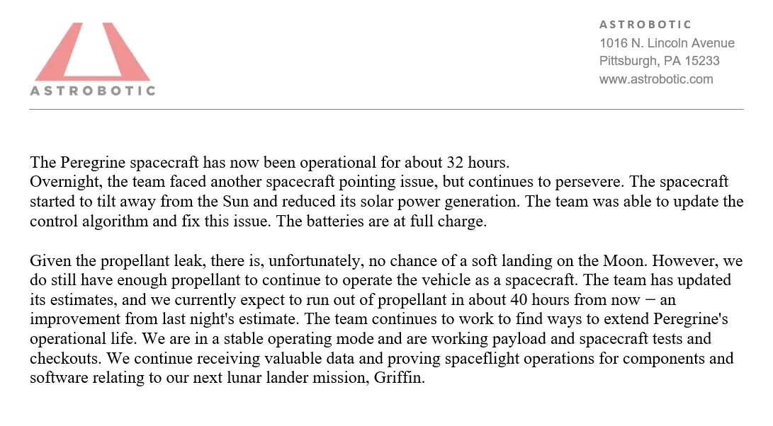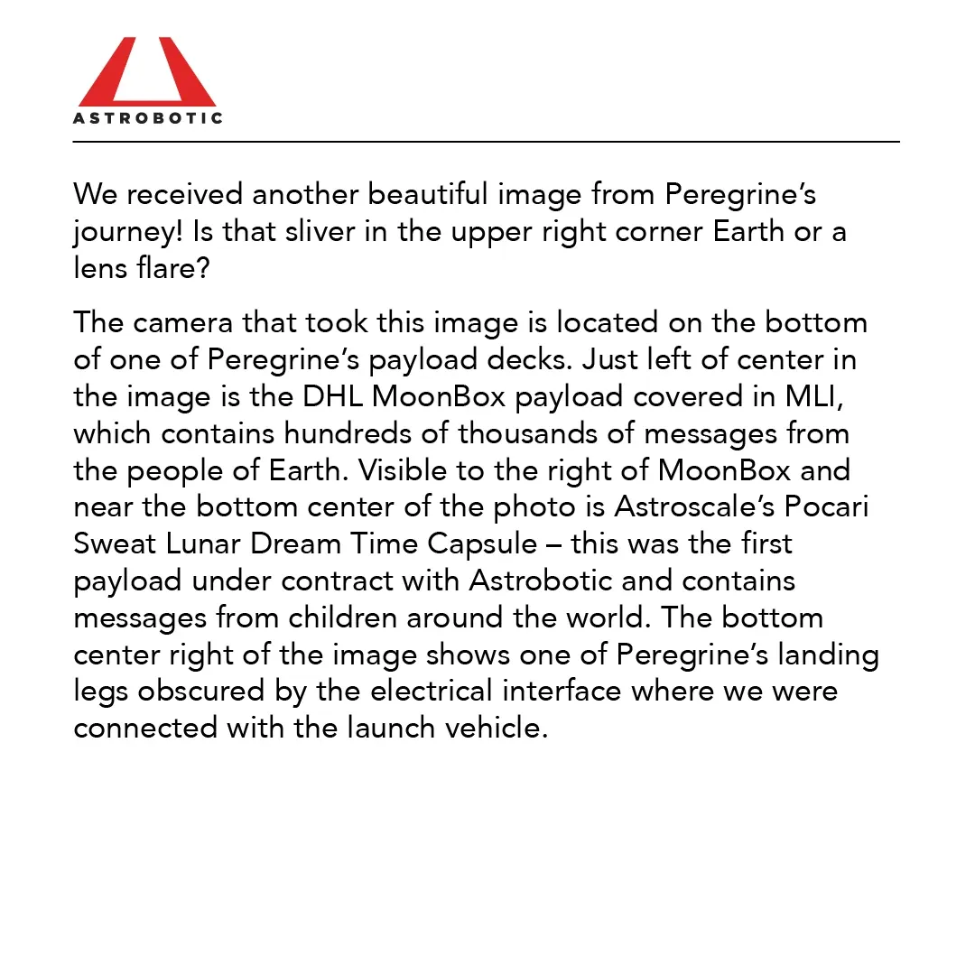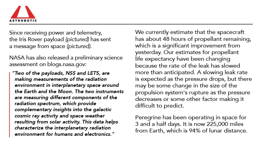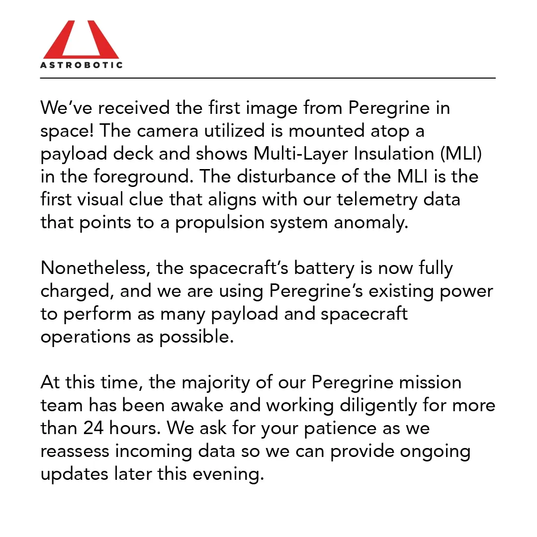 Ahora hay que esperar alrededor de 45 a 60 días para que la nave no tripulada, Peregrine, pueda alunizar. Una vez en la superficie lunar, los robots trabajarán de forma colectiva para obtener datos científicos novedosos sobre el plasma polvoroso que cubre nuestro satélite natural, lo que permitirá preparar nuevas misiones para la futura minería de cuerpos celestes, como asteroides y lunas distantes.