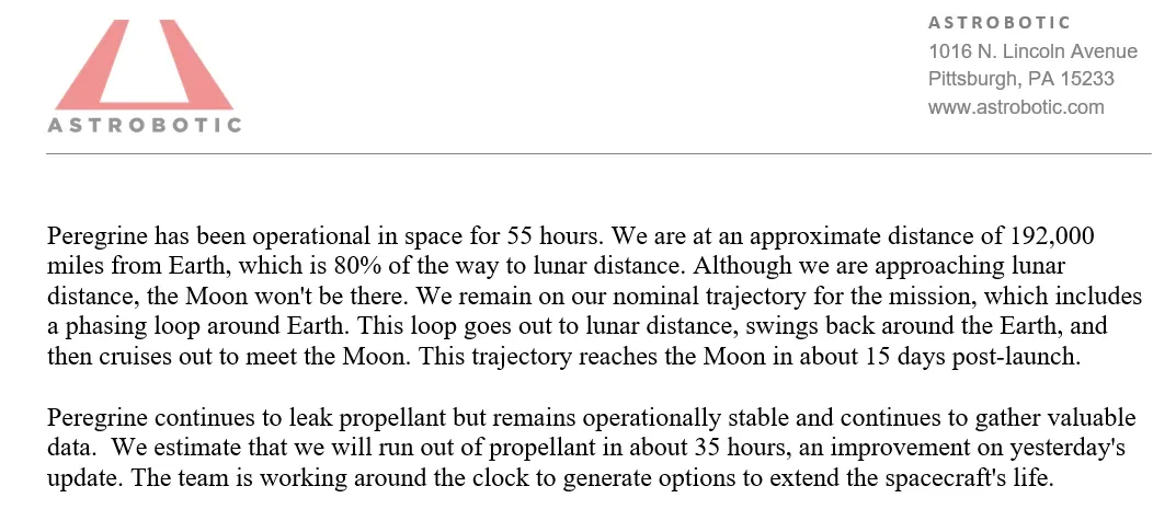Ahora hay que esperar alrededor de 45 a 60 días para que la nave no tripulada, Peregrine, pueda alunizar. Una vez en la superficie lunar, los robots trabajarán de forma colectiva para obtener datos científicos novedosos sobre el plasma polvoroso que cubre nuestro satélite natural, lo que permitirá preparar nuevas misiones para la futura minería de cuerpos celestes, como asteroides y lunas distantes.