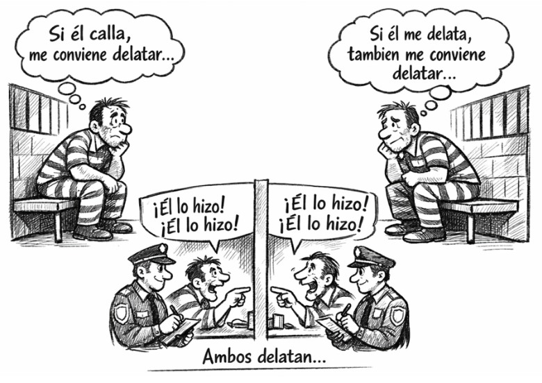 Ahora bien, cada prisionero se encuentra incomunicado en su celda. Desde su punto de vista hay dos posibilidades: si su compañero no lo delata, lo mejor para él es delatarlo. Así puede salir libre. Pero si su compañero lo delata, lo mejor para él es delatarlo también, para no recibir cuatro sino tres años de prisión. En ambos casos lo mejor es delatar.
