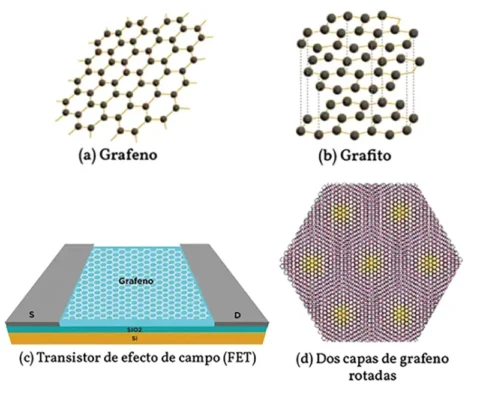 Figura 1. (a) Modelo molecular de la estructura bidimensional del grafeno; (b) grafito formado por infinitas capas de grafeno apiladas verticalmente (apilamiento llamado ABABABA…); (c) transistor de efecto de campo (FET) usando grafeno; (d) modelo molecular de bicapa de grafeno rotado, formando un patrón de Moiré.