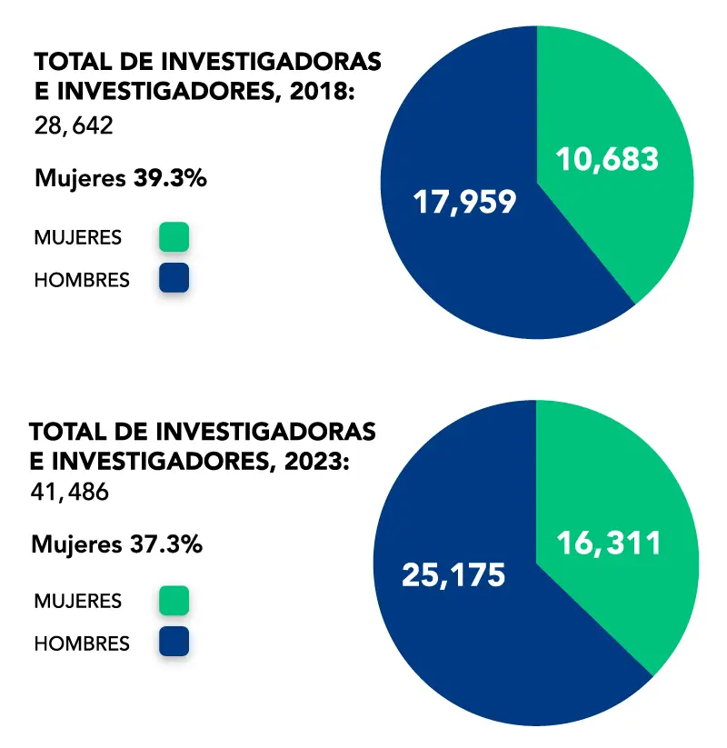 Vamos a dar algunas cifras que muestran que, aunque hemos avanzado, falta un trecho por cubrir. Tal vez sea el momento de un segundo Congreso de Investigadoras. En la Figura 1 se muestra el porcentaje de investigadoras en el SNI, durante el año 2018 y el año 2023. Hay que destacar la buena noticia de que en estos cinco años ha habido un aumento considerable de investigadores nacionales. Sin embargo, el aumento de porcentaje de mujeres tan solo pasó de un 37.3% a 39.31%. Siguiendo este ritmo de crecimiento faltarían, aproximadamente, 25 años para llegar a la paridad.