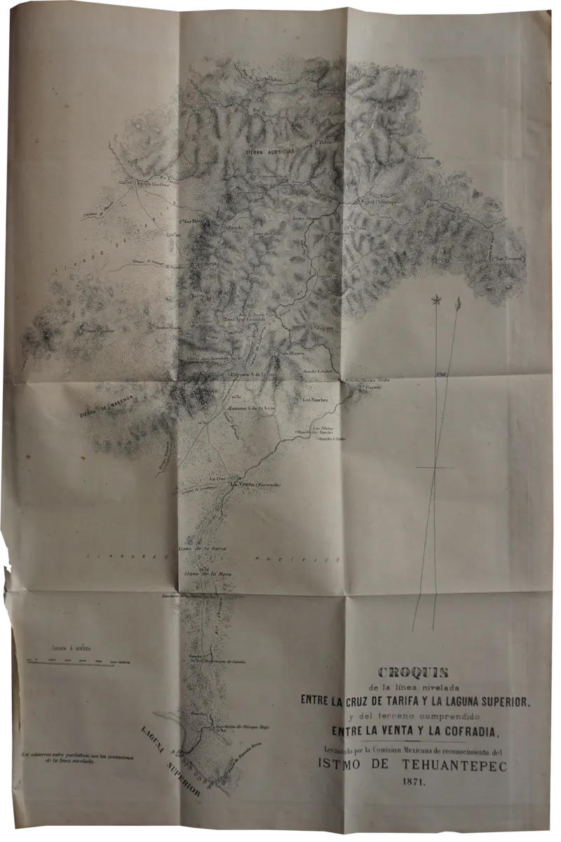 Este mapa es una representación detallada del relieve y las rutas del Istmo. muestra una de las primeras representaciones sistemáticas del Istmo de Tehuantepec con una cuadrícula georreferenciada, lo que sugiere que fue utilizado para cálculos de coordenadas y planificación de rutas.