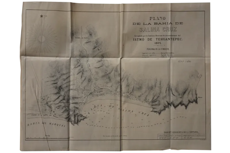 Detalla la topografía de la región costera de Salina Cruz, en el estado de Oaxaca, México, incluyendo la bahía, la laguna y caminos cercanos. Está vinculado a los estudios de factibilidad para desarrollar un paso interoceánico en el Istmo durante el siglo XIX. En ese período, México evaluaba opciones para conectar el Golfo de México con el Océano Pacífico, mucho antes de la construcción del Canal de Panamá (1914).