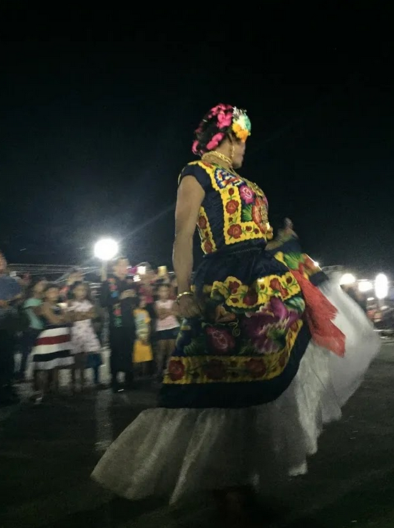 Mayte provenía de la Séptima —Juchitán se divide en nueve secciones—. Mi memoria la pinta sonriente, al mismo tiempo dulce pero también pícara al hablar. Las veces que la vi, portaba los mejores diseños entre la comunidad, varios de los cuales ella misma confeccionaba. La recuerdo, por ejemplo, con un vestido entalladísimo, color beige, estampado con flores, con una abertura larga que mostraba sus piernas musculosas, y un escote en “v” que enseñaba parte de sus pechos. Era una diva.