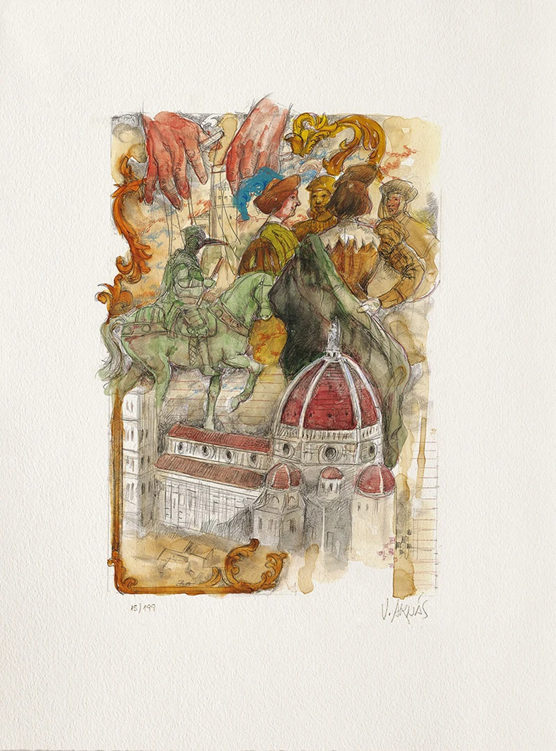Son muchas las ediciones y traducciones del tratado político más famoso de Nicolás Maquiavelo. Pero El príncipe de Liber Ediciones, en coedición con Lamán Carranza, es una obra de arte. Cada pieza es única, pues contiene 15 grabados originales de Manuel Alcorlo, Vicente Arnás y Pedro Osés, numerados y firmados, además de dibujos litográficos entre el texto. Compartimos aquí algunos de esos magníficos grabados.